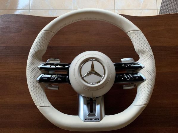 The Mercedes Benz Steering Wheels upper and lower halves are covered in smooth beige leather, the side structures are wall-mounted in perforated beige leather with beige thread, the central structure and button panel are gloss black, the shift paddles and airbag are silver leather, and the airbag is beige leather.